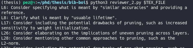 reviewer_2.pyis an LLM-based LaTeX document review system (i.e., proofreading āAIā, using gpt3.5-turbo). It provides feedback on your writing style and quality, and has some (sketchy) domain knowledge thanks to being trained on the web.Take its output with a pinch of salt (as you should with any human proofreader), and definitely donāt use it to write your papers. However, Iāve found it to be super-handy in catching issues that my spelling and grammar checkers have not.